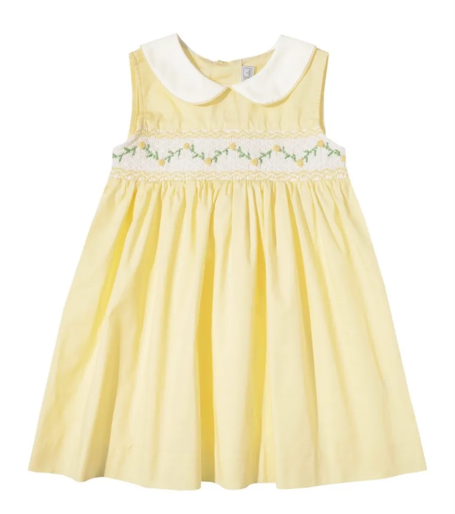 Delicate and timeless, this butter yellow smocked dress is thoughtfully designed for little ones. Featuring a classic white petal collar and hand-smocked detailing across the bodice, the dress is beautifully finished with soft floral embroidery for a sweet, vintage touch.