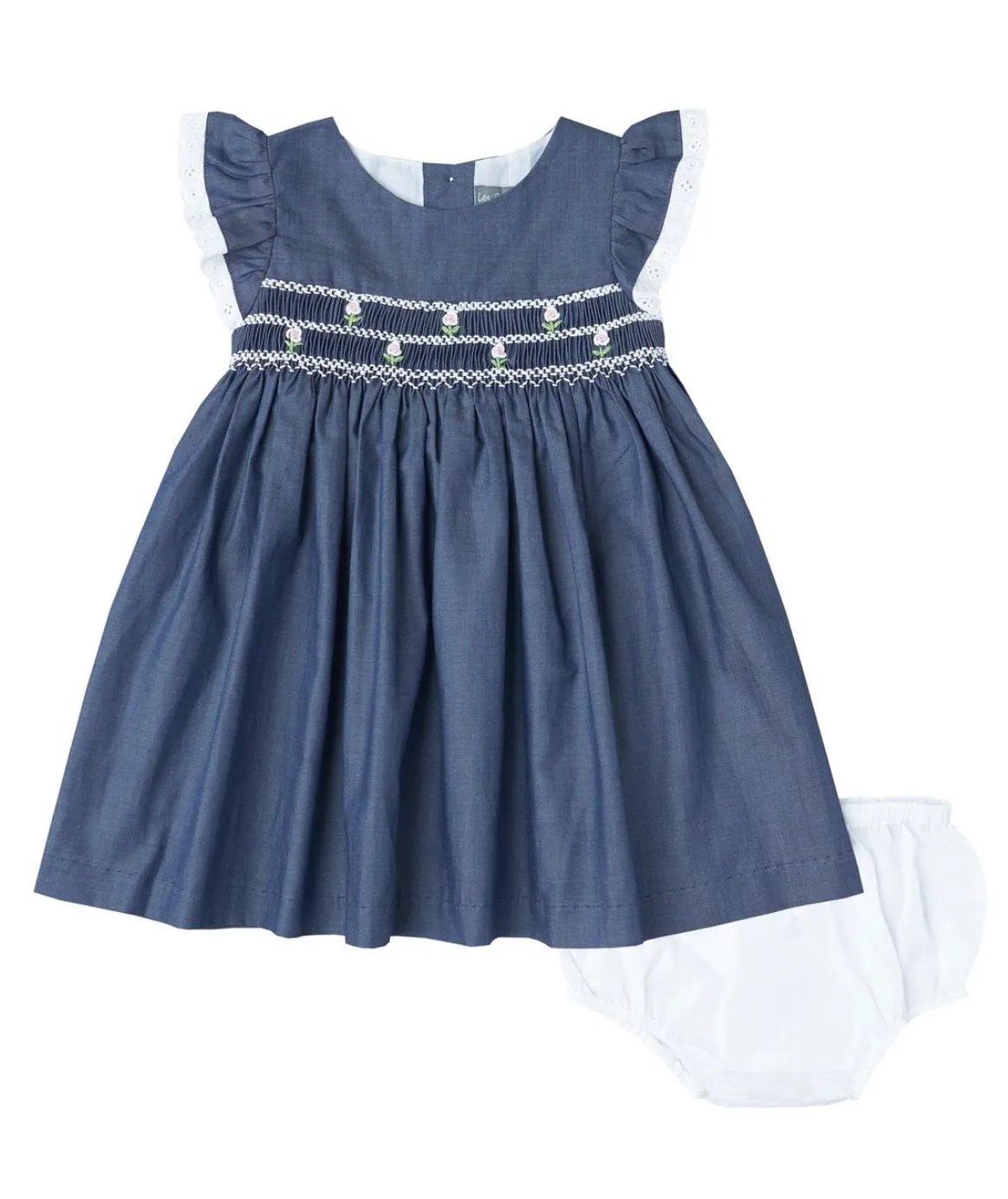 Beautifully crafted in a rich navy tone, this smocked dress showcases intricate hand-smocked detailing with dainty floral embroidery across the bodice. Ruffled sleeves with delicate trim add a soft, vintage-inspired touch, while the matching bloomer completes the look for little ones.