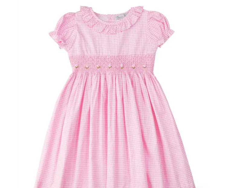 Sweet and timeless, this pink gingham smocked dress features delicate hand-smocked detailing, soft puff sleeves, and a charming ruffled collar. Lightweight and comfortable, it’s perfect for everyday wear and special little moments.